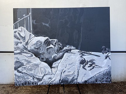 Seen here on his death bed in 1873, Napoleon III was elected president in 1848 before seizing power a few years later and declaring himself emperor. Big on infrastructure and modernization (Haussmanization, etc.), he was a populist monarch and the last France had. (Sigh.) Lying in profile, expired as such, the painting also points to another time, a century later, when Stephen Kaltenbach painted his monumental, psychedelic, indelible Portrait of My Father (1972-79), capturing the end of life similarly posed as well a time of cultural growth and possibility. (Sigh.) And about a decade before Napoleon III’s death and a continent away, a photograph was taken in the 1860s of the last Chumash shaman that served as the basis of Roeder’s first show at The Finley, which took place about a decade before today in 2011 and was identically titled, “Well, these are the times we find ourselves in.”